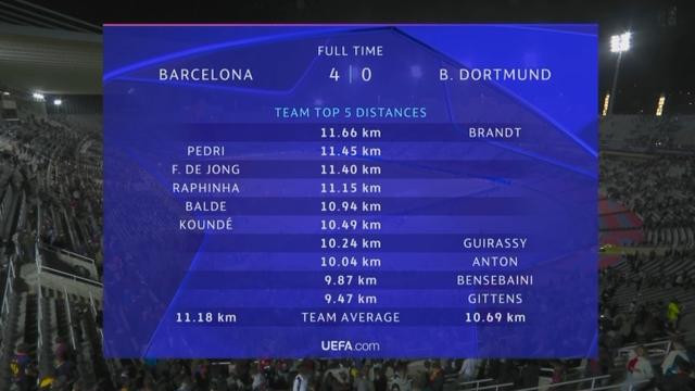 巴萨4-0多特跑动: 布兰特居首, 巴萨佩德里、德容、拉菲等5人前6